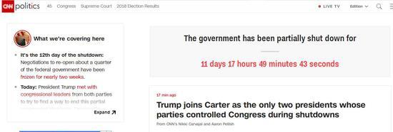 美国CNN官网对美国政府部分关门时间进行计时。(图源:CNN)