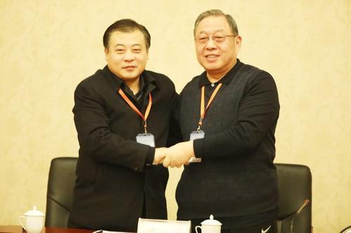 ◀签字仪式后山西晋绥文化教育发展基金会秘书长段晓飞和中共兴县县委书记梁志峰紧紧握手。