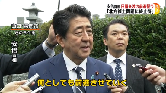 6日,安倍在山口县给父亲扫墓时,对记者表示:"无论怎样我都将积极推进日俄谈判。我发誓,为了解决领土争端,给签署和平条约问题画上终止符,我将尽全力促成此事。"