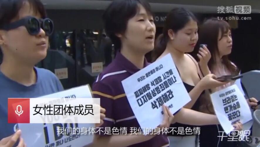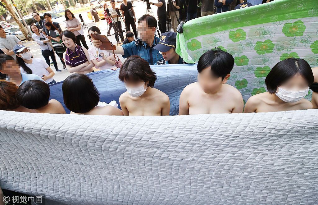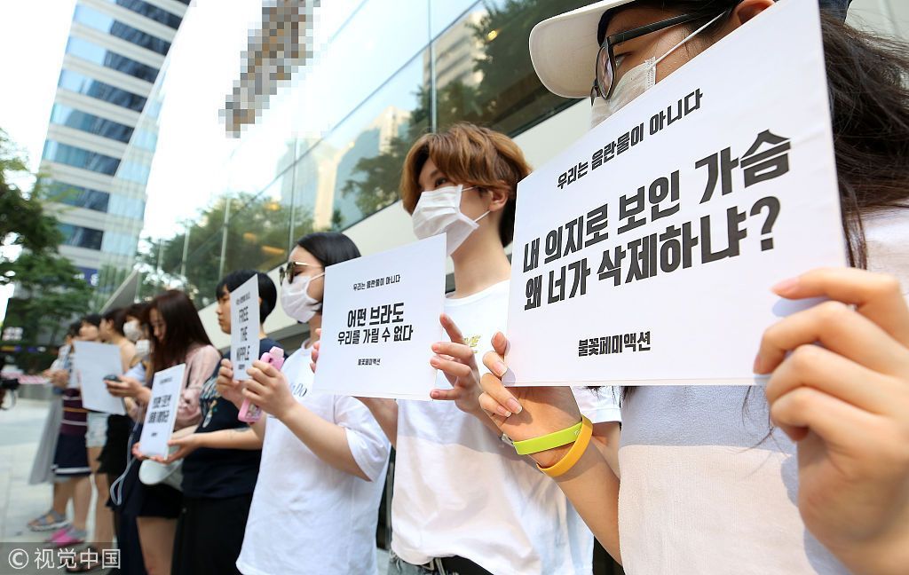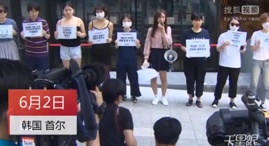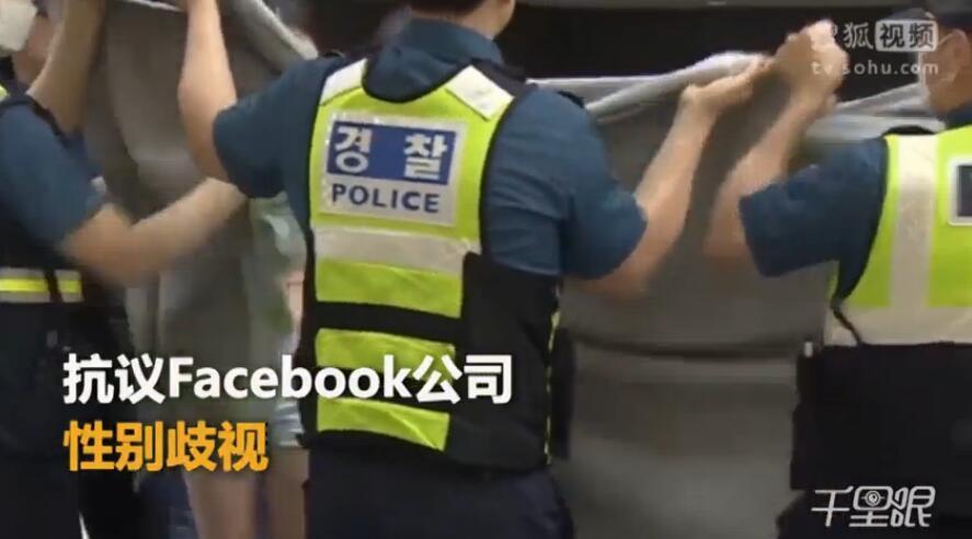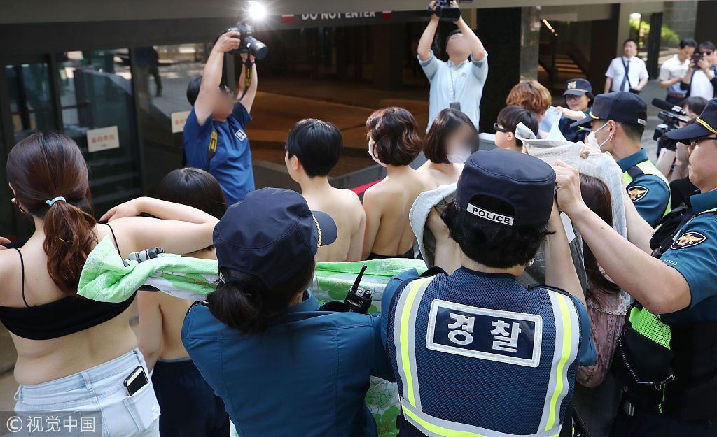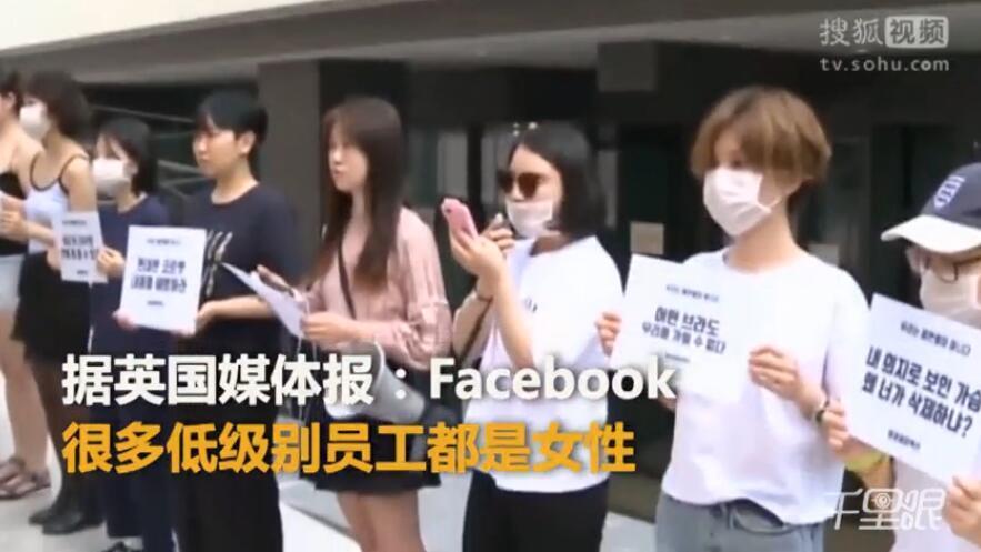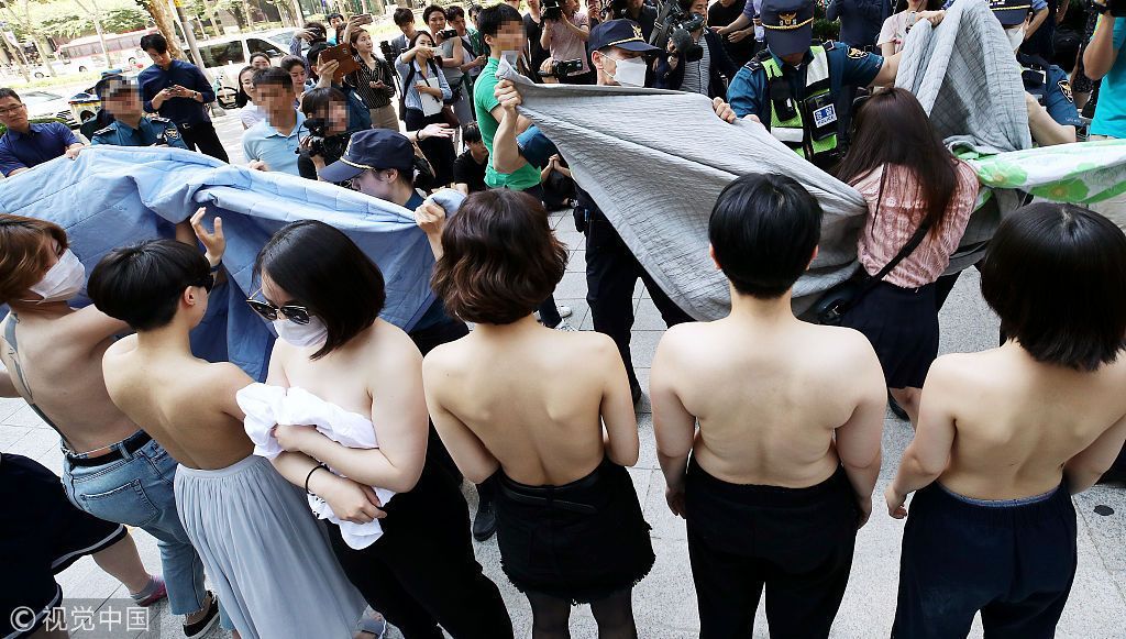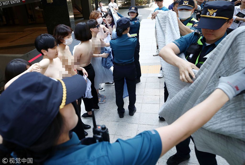 当地时间2018年6月2日,韩国首尔,女性团体成员集会时赤裸上身,抗议Facebook公司性别歧视。