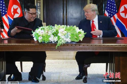 当地时间6月12日,朝美首脑会晤在新加坡嘉佩乐酒店举行,金正恩和特朗普下午出席签字仪式,双方签署此次朝美峰会历史性文件。