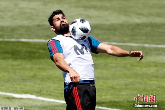 西班牙队的驻地在俄罗斯南部的克拉斯诺达尔,图为西班牙锋线大将迭戈·科斯塔在训练中。