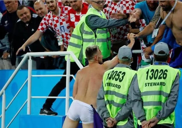 比赛结束后,取得胜利的克罗地亚队疯狂的庆祝,拉基蒂奇在与球迷互动过程中,将身上穿的球衣球裤都送给了球迷,而自己只能光溜溜的在场上来回走动,当拉基蒂奇回到替补席与队友庆祝时,克罗地亚队的一位女性工作人员害羞的将头转向了一边,不敢直视拉基蒂奇这疯狂的一幕。