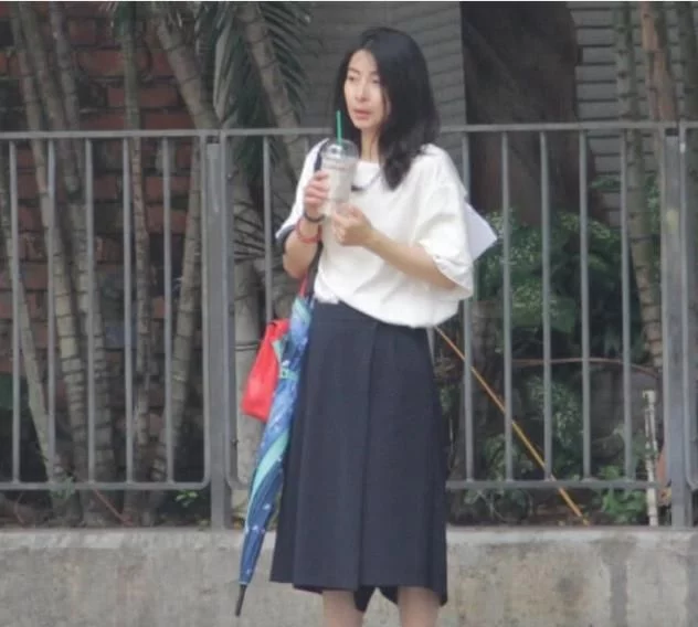穿着一件黑色半身裙,宽松设计,一看就是上了年纪的打扮,同时白色上衣,简单随性,发型没有过多修饰,走在人群中就被埋没了。