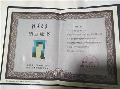 新京报记者查询到,所谓的"毕业证书"是清华大学继续教育处颁发的。而清华大学继续教育处工作人员则表示,继续教育处每年举办很多培训项目,会发放结业证书,而不是毕业证书。