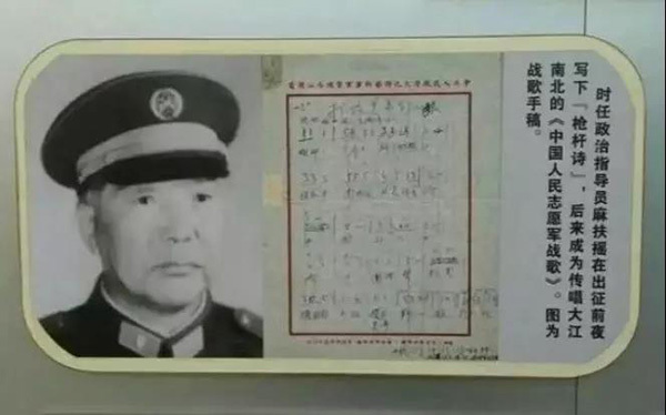 谈起这首歌词,麻扶摇豪爽地说:“那时候,我根本不懂写歌词,也不是为唱歌而写词。战歌唱响后,有人说我成了名人,是歌词作家,我一概摇头否认。我只是志愿军的一名普通战士,是人民军队里的一名政治工作者。”