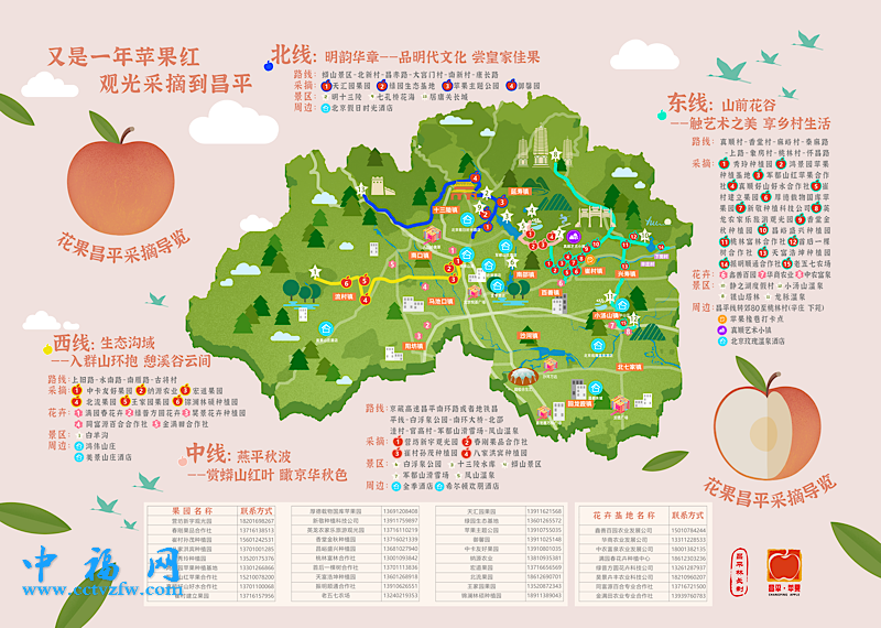 为方便市民采摘出行,昌平区园林绿化局推出“花果昌平采摘导览图”,共设置4条特色专线,将苹果文化与红叶文化、长城文化、明文化、温泉文化等昌平特色文化相融合,让市民深度体验大美昌平的魅力。此外,本届苹果嘉年华活动还将与崔村苹果小镇、流村百里环廊等文旅休闲区块形成联动效应,陆续举办苹果骑行、苹果音乐会、家庭园艺进社区等精彩内容。