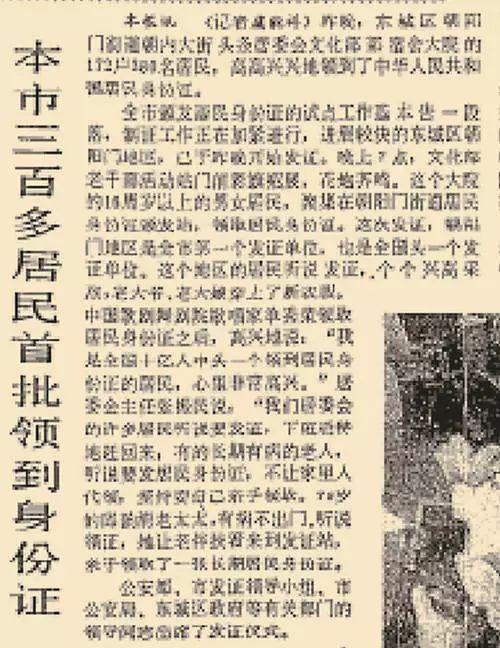 北京全面颁发居民身份证是在1984年10月,不过,当年5月起,东城区朝阳门、原宣武区天桥、朝阳区八里庄、原顺义县杨镇地区先期进行了试点。1984年8月30日晚,东城区朝阳门街道朝内大街头条居委会文化部宿舍大院的172户380名居民领到了中华人民共和国居民身份证。当天,他们个个兴高采烈,老大爷、老大娘穿上了新衣服,如同过年一般喜庆。(1984年8月31日《北京日报》1版,《本市三百多居民首批领到身份证》)
