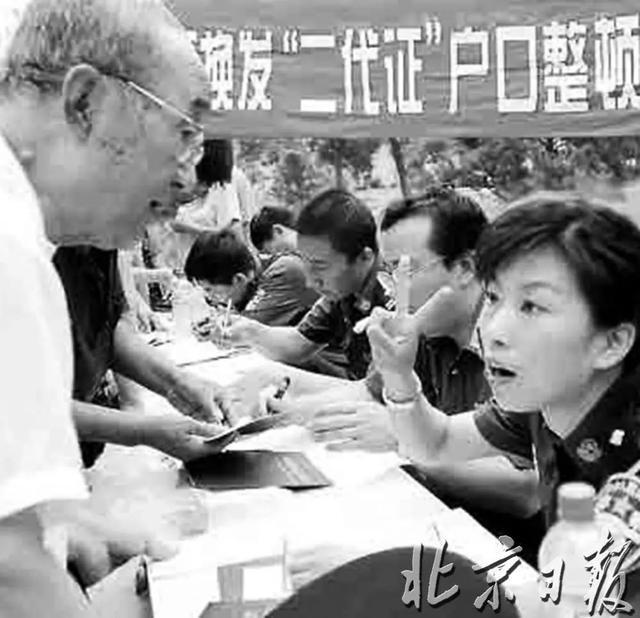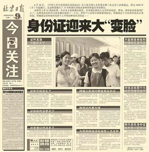 2004年5月16日,北京第二代居民身份证首发。与“一代证”相比,第二代身份证更耐磨,防伪性能更强,用10倍以上放大镜可以看到底纹中的缩微文字字符串,自然光条件下,垂直看不到证上的“长城”图案,随着倾斜角度的变化,图案出现而且颜色会不断改变。