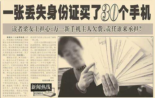 2001年,在东城区东四街道工作的梁女士给本报新闻热线打来电话说,自从4月份她丢了身份证后,就不断收到北京移动通信公司寄来的确认信,敢情有人用那张丢失的身份证,买了30多个新手机。她怕新手机的主人欠费导致自己承担责任,只好赶到指定的销售处去销号,每次去都要耽误三个多小时……(2001年12月14日《北京日报》7版,《一张丢失身份证买了30个手机》)