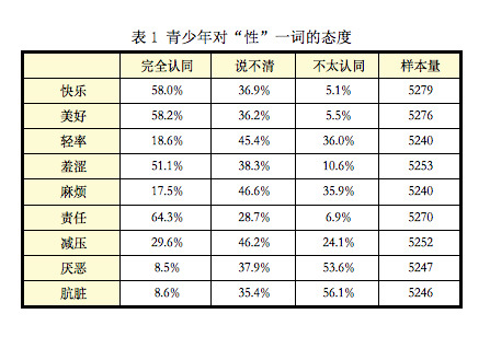 调查显示,认同性是“快乐”和“美好”的青少年比例是58.0%和58.2%,而不认同的比例为5.1%和5.5%;有64.3%的青少年认同性是一种“责任”,不认同的比例为6.9%。