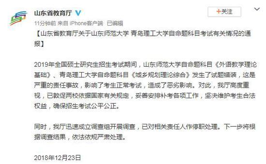 2019年全国硕士研究生招生考试期间,山东师范大学自命题科目《外语教学理论基础》、青岛理工大学自命题科目《城乡规划理论综合》发生了试题错装,这是严重的责任事故,影响了考生正常考试,造成了恶劣影响。对此,我厅高度重视,已敦促两校依据国家有关规定,妥善安排补考各项工作,坚决维护考生合法权益,确保招生考试公平公正。
