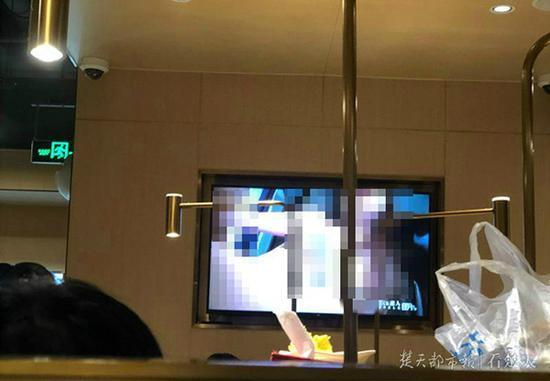另外一名网友也在微博中说起此事,显示定位在海底捞江汉路一家餐厅。通过该网友发布的照片,楚天都市报记者看到,电视画面中一名女性赤身裸体,画面不雅。