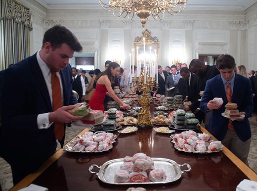 美国总统特朗普买了许多快餐食品,招待来到白宫访问的大学生橄榄球队员。(图:今日美国)