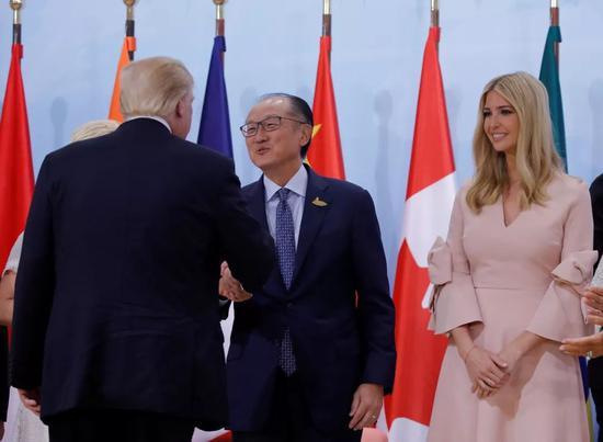 ▲资料图片:当地时间2017年7月8日,德国汉堡,美国总统特朗普出席妇女创业融资会,与金墉(中)握手。(视觉中国)