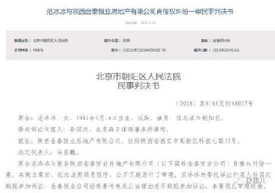 9月20日,北京法院审判信息网公开了与范冰冰有关的6份一审民事判决书。