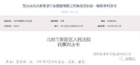 法院判决:北京宜健三业医院有限公司于本判决生效后七日内以书面的形式向原告范冰冰赔礼道歉,否则将选择一家全国范围内公开发行的报纸,刊登本判决主要内容;赔偿范冰冰经济损失100 000元。驳回了范冰冰的其他诉讼请求。