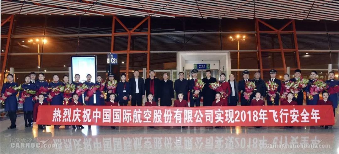 2018年12月31日晚,随着北京总部、分公司、投资企业的航班陆续回到首都机场,中国国际航空公司顺利实现2018飞行安全年。早已在现场等候的民航局党组书记、局长冯正霖,中航集团(国航股份)董事长、党组(党委)书记蔡剑江,总经理(总裁)、党组(党委)副书记宋志勇,中航集团(国航股份)副总经理(副总裁)冯刚、马崇贤,国航股份副总裁柴维玺、刘铁祥等在京领导向归航机组送上鲜花和祝福,并到机坪慰问奋战在现场的机务和地面保障人员,在喜庆氛围中共贺2018飞行安全年。