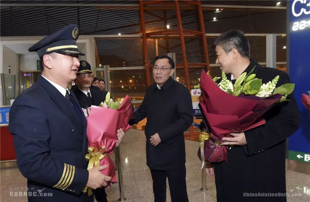 图:中航集团(国航股份)董事长、党组(党委)书记蔡剑江,总经理(总裁)、党组(党委)副书记宋志勇等在京领导为CA1410机组献上鲜花。