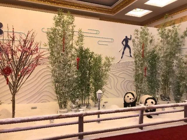 为衬托冬季运动主题,一向严肃庄重的人民大会堂西大厅被冰雪元素装扮一新,中国的大熊猫和芬兰的驯鹿在银装素裹背景下相映成趣。